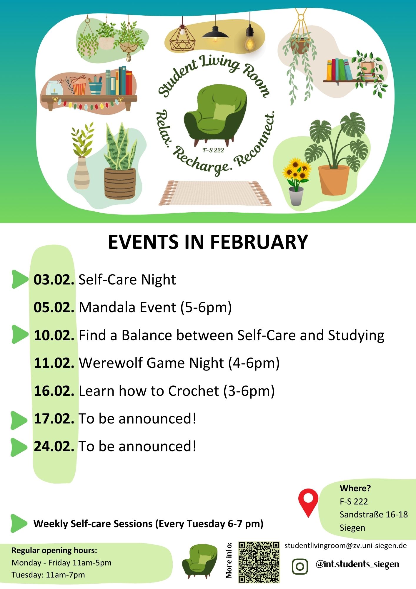 In the Student living Room, we regularly offer events and workshops centered around Well-being and Self- Care, such as mindfulness sessions, international cooking evenings, and open discussion rounds. Whether you're looking for a place to unwind, engage in relaxing activities like meditation, or prefer a more interactive experience with games and creative workshops, there’s something for everyone. These activities will help you settle in Siegen, learn from fellow students, and foster a sense of community together.