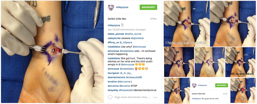 Immer mehr Follower beginnen unmittelbar auf die Bilder von Miley Cyrus zu reagieren. Sie postet eine Spinne, ein Follower collagiert sie mit Cyrus’ Gesicht. „shiiiiit that was fast #quickassfanart“ kommentiert sie. Seither ist ihr Instagram-Account tatsächlich ein „collab“, die wilden Collagen sind auch ästhetisch nicht mehr voneinander zu unterscheiden.